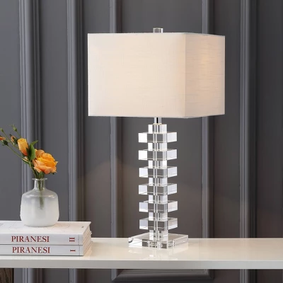 Modern yet timeless, the geometric crystal cubes on the base of this 28″ high table lamp will bring a touch of glam and extra light to any dim corner. At nearly 30″ tall, you can make a statement by adding a pair on either side of a console or buffet, or use a single lamp to give your desk the designer touch with this updated take on a classic style. Crafted of crystal, it’s finished with a bright white drum shade and coordinating finial.