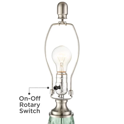 From the talented artisans at 360 Lighting, these modern table lamps are crafted from light seafoam color green glass. The glass has a translucent quality, and features a textured pattern of whorls and rounded diamonds. Brushed nickel finish accents and off-white drum shades up to[ add a clean, classic touch. Offering a lovely look for your home, this glass table lamp is perfect for contemporary and coastal room style settings.