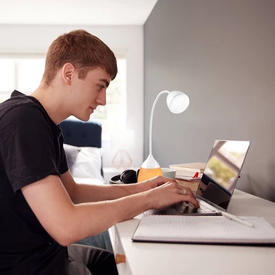 Create a healthier workspace with the OttLite Mood LED Desk Lamp with Color Changing Base. OttLite’s exclusive ClearSun® LED technology reduces eyestrain by up to 51% creating a more comfortable place for you to work, study, read and more! Plus, the fun color changing base glows in the color of your choice so you can set it for whatever mood you’re in. Or let it cycle continuously through the entire 256-color spectrum! With three brightness settings and a flexible neck, you can position the light wherever you need it. And, the convenient 5V, 2.1A USB port fully charges all your devices including phones and tablets.